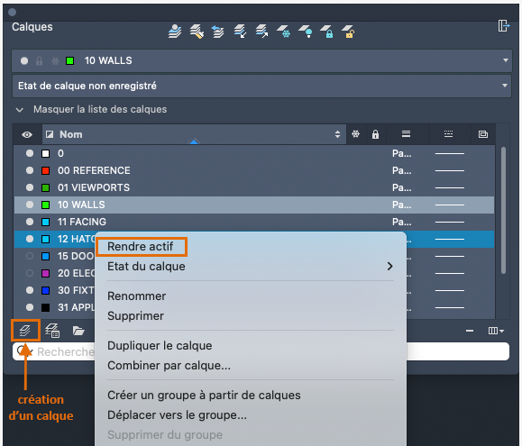 Pour créer un calque, cliquez sur le bouton affiché, puis entrez le nom du nouveau calque. Pour modifier le calque courant, double-cliquez sur son nom ou cliquez avec le bouton droit de la souris sur le nom du calque et choisissez Rendre actif.