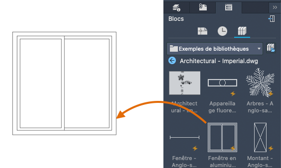 - Dans la palette de blocs, double-cliquez pour placer le bloc ou faites-le glisser pour le placer. Lorsque vous double-cliquez pour placer le bloc, vous pouvez utiliser les accrochages aux objets pour plus de précision.