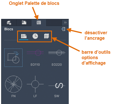 Vous pouvez également accéder à un fichier de dessin et l'insérer en tant que bloc ou afficher les blocs sur le dessin dans la palette des blocs.