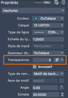 Lorsque vous lancez la commande HACHURES, le viseur Hachures s'affiche temporairement. Dans cet onglet, vous pouvez choisir parmi différents motifs de hachures ISO et anglo-saxons conformes aux normes industrielles, ainsi que de nombreuses options spécifiques.