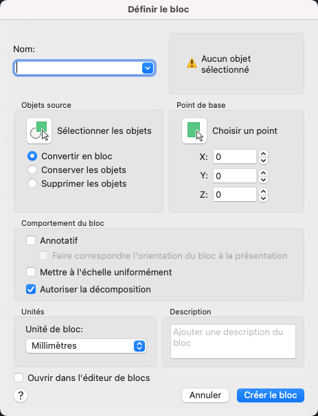 Convertit les objets sélectionnés en occurrence de bloc dans le dessin une fois le bloc créé.