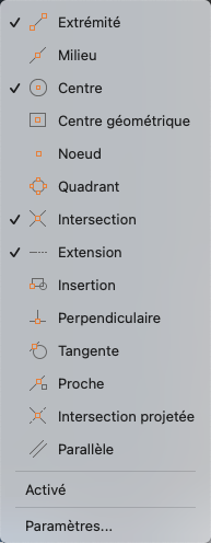1. Dans la barre d'état, cliquez sur Accrochage aux objets avec le bouton droit de la souris, puis choisissez Paramètres.
