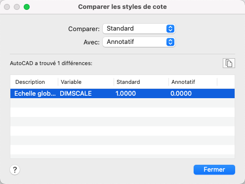 Affiche les résultats de la comparaison des styles de cote. Si vous comparez deux styles différents, les propriétés qui diffèrent s'affichent. Si vous définissez le deuxième style sur <aucun> ou sur le même style que le premier, toutes les propriétés du style de cote s'affichent.