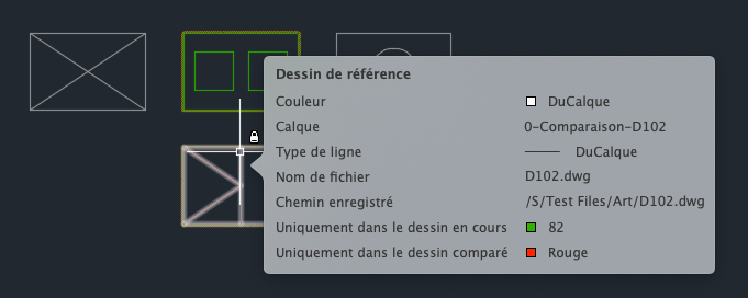 Au cours d'une comparaison de dessins, l'info-bulle de survol inclut les informations supplémentaires suivantes :