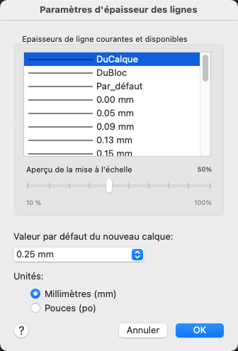 Définit l'épaisseur de ligne courante et les unités d'épaisseur de ligne, gère l'affichage et l'échelle d'affichage des épaisseurs de ligne et indique l'épaisseur de ligne par défaut des calques.