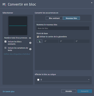 Vous pouvez également convertir l'objet source ou les occurrences sélectionnées en un nouveau bloc. Dans la boîte de dialogue Convertir, définissez un nouveau bloc en indiquant un nom de bloc et un point d’insertion. Par défaut, le point d’insertion est défini sur le centre de la géométrie sélectionnée.