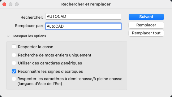 La casse de tous les caractères de la chaîne de texte doit correspondre à la casse du texte indiqué dans Rechercher. Lorsque cette option est désactivée, le programme recherche les chaînes correspondant à celle spécifiée sans tenir compte de la casse.