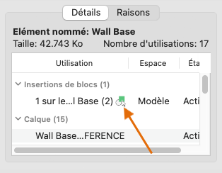 Vous pouvez afficher un aperçu et localiser les références des blocs ne pouvant pas être purgés du dessin courant.