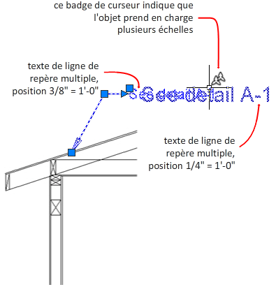 Les objets annotatifs vous permettent de créer un objet d'annotation pouvant représenter plusieurs tailles ou échelles. Au lieu de créer plusieurs occurrences de l'objet d'annotation sur des calques distincts, vous pouvez activer la propriété Annotatif d'un objet d'annotation et attribuer autant d'échelles de dessin que nécessaire à l'objet.