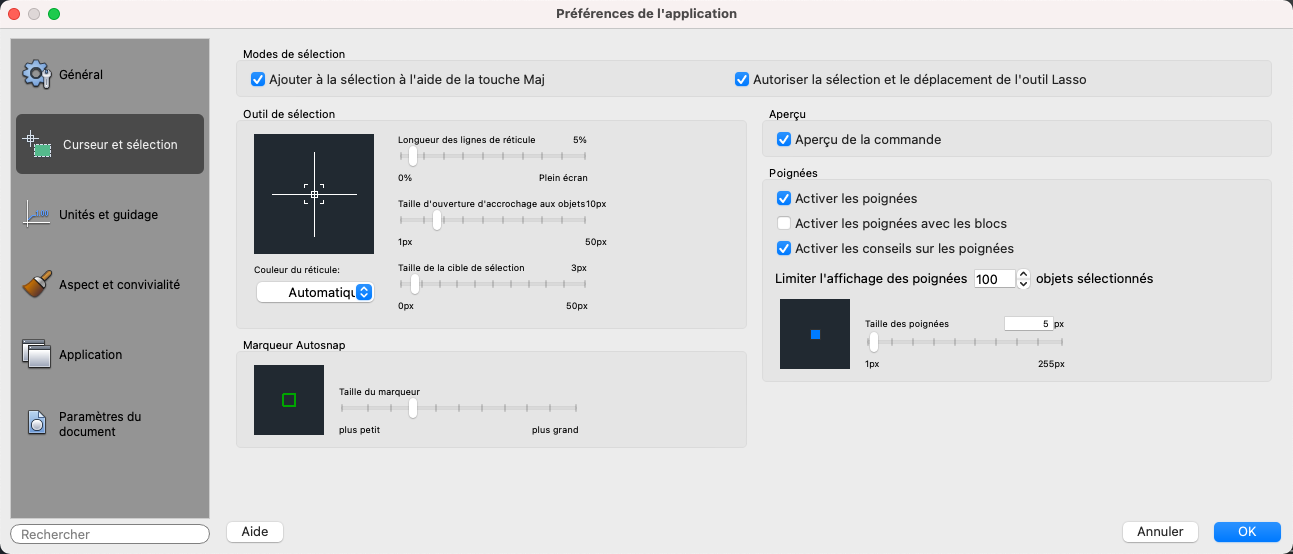 Onglet Curseur et sélection (boîte de dialogue Préférences de l'application)
