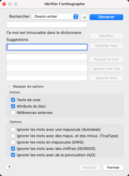 Vérifie l'orthographe dans le texte sur une ligne, le texte sur plusieurs lignes, le texte à l'intérieur d'attributs de blocs, le texte à l'intérieur de xréfs et le texte ajouté aux cotes.