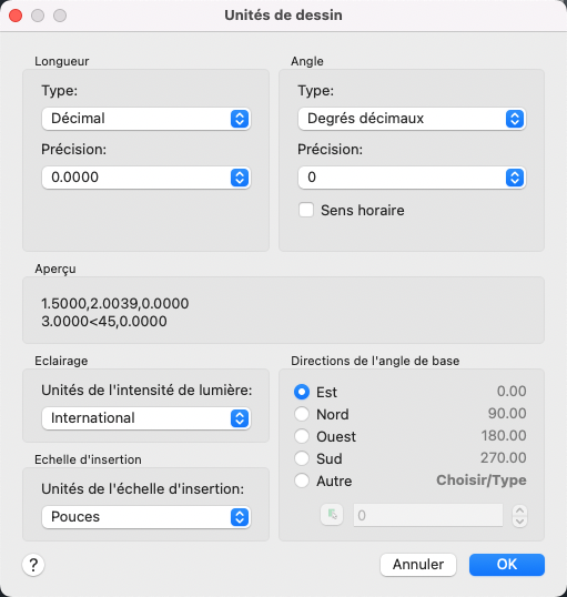 Définit la direction de l'angle zéro. Les options suivantes affectent l'entrée des angles et l'entrée des coordonnées polaires, cylindriques et sphériques.