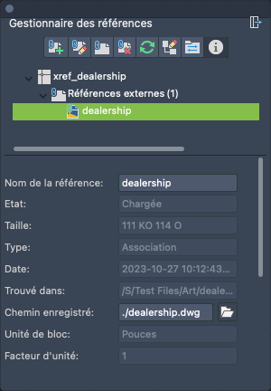 Une barre d'outils s'affiche en haut de la palette Gestionnaire des références. Vous pouvez cliquer avec le bouton droit sur la liste des fichiers pour afficher un menu contextuel qui permet d'associer ou de gérer une référence externe attachée. Cliquez sur le bouton Afficher les détails dans la barre d'outils pour afficher les détails et l'aperçu miniature de la référence externe sélectionnée.