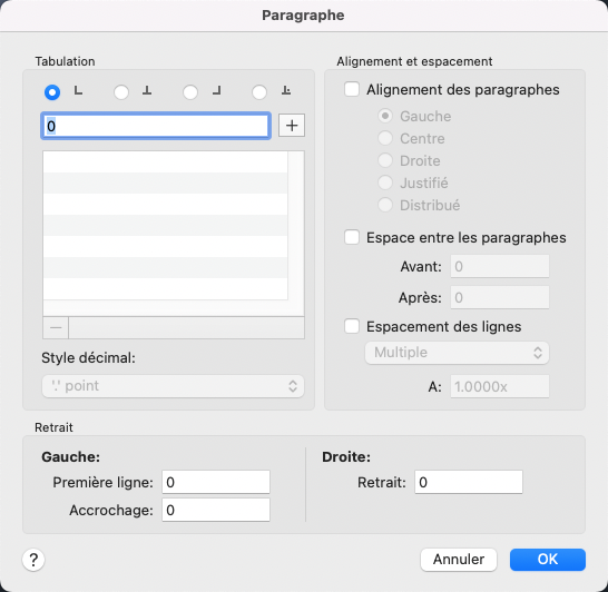 Affiche les options de définition des tabulation, y compris pour ajouter et supprimer des tabulations. Les options comprennent les tabulations gauche, centre, droite et décimales. Vous pouvez également définir les tabulations avec le bouton de sélection des tabulations sur la règle de l'éditeur de texte sur place.