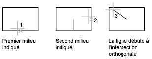 Dans cet exemple, la fonction de repérage permet de localiser le centre d'un rectangle sans faire appel à des droites de référence. Activez la fonction de repérage et spécifiez le milieu d'une ligne horizontale (1). Faites glisser le curseur verticalement et spécifiez le milieu d'une ligne verticale (2). Appuyez sur Entrée pour accepter le point (3) situé au centre du rectangle.