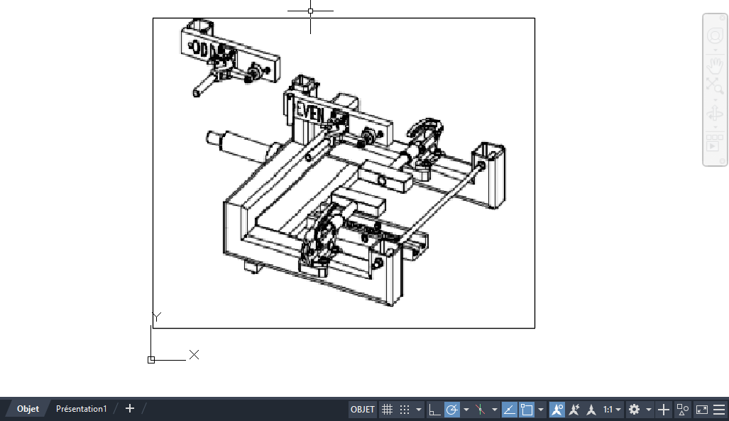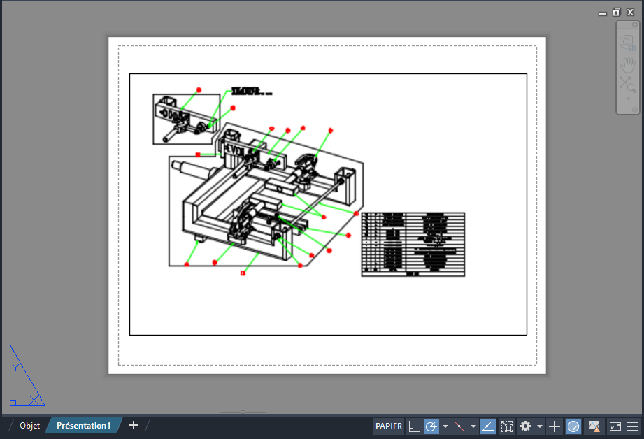 - Pour préparer le dessin en vue de l'impression, passez à l'espace papier. De là, vous pouvez définir différentes présentations avec des cartouches et des notes. Sur chaque présentation, vous pouvez créer des fenêtres de présentation qui affichent des vues différentes de l'espace objet. Dans les fenêtres de présentation, vous effectuez une mise à l'échelle des vues de l'espace objet en fonction de l'espace papier. Une unité dans l'espace papier représente la distance réelle sur une feuille de papier, en millimètres ou en pouces, selon la configuration de votre mise en page.