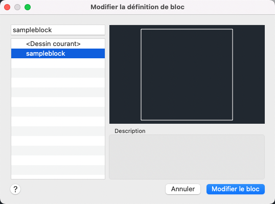 Affiche un aperçu de la définition de bloc sélectionnée. Une icône représentant un boulon clignotant indique que le bloc est un bloc dynamique.