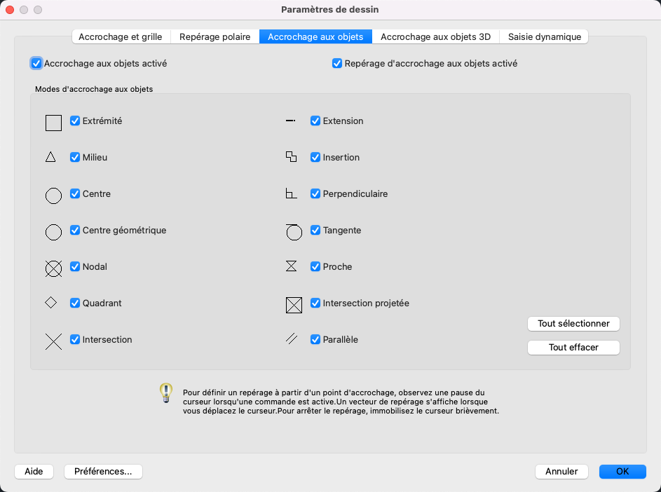 Les paramètres d'accrochage aux objets actifs vous permettent de définir un point d'accrochage en une position exacte d'un objet. Si vous choisissez plusieurs options, le programme utilise les modes d'accrochage sélectionnés pour renvoyer le point le plus proche du centre du curseur carré. Appuyez sur TAB pour passer d'une option à l'autre.