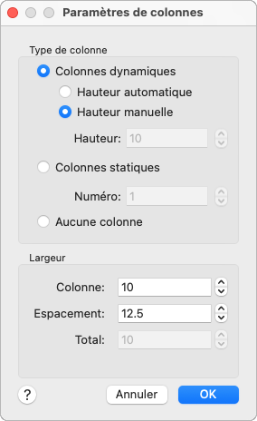 Définit le nombre de colonnes. Cette option est active uniquement lorsque vous sélectionnez Colonnes statiques.