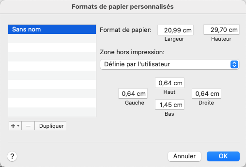 - Dupliquer Copie le format de papier sélectionné pour créer une format de papier personnalisé que vous pouvez ensuite modifier.