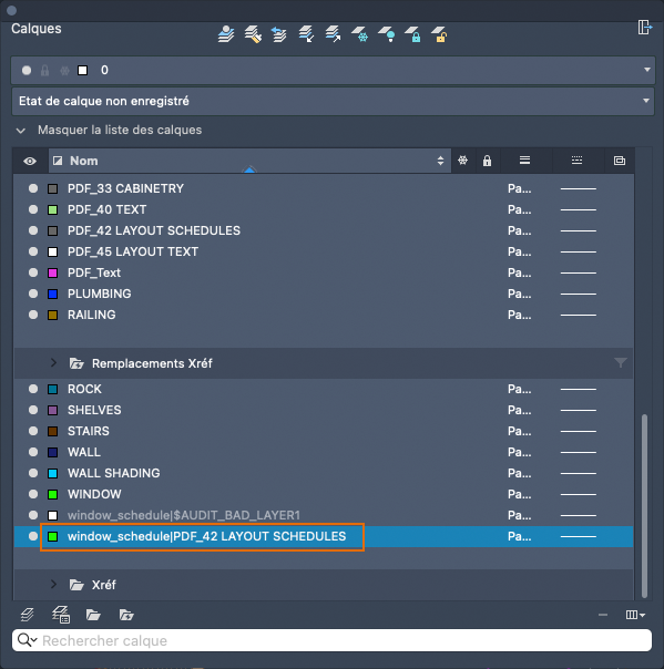 Lorsque vous attachez un fichier de dessin, son calque et les propriétés du calque sont ajoutés au dessin en cours. Chaque nom de calque est précédé du nom de la Xréf, qui peut être différent du nom du fichier du dessin référencé.