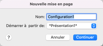 Indique la mise en page à utiliser comme point de départ pour la nouvelle mise en page. Lorsque vous cliquez sur Continuer, la boîte de dialogue Mise en page s'affiche, présentant les paramètres de la mise en page sélectionnée que, au besoin, vous pouvez modifier.