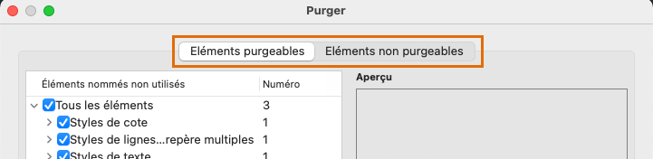 Supprime du dessin les éléments non utilisés, comme les calques ou les définitions de blocs. Affiche les éléments qui peuvent être purgés.