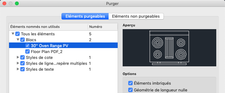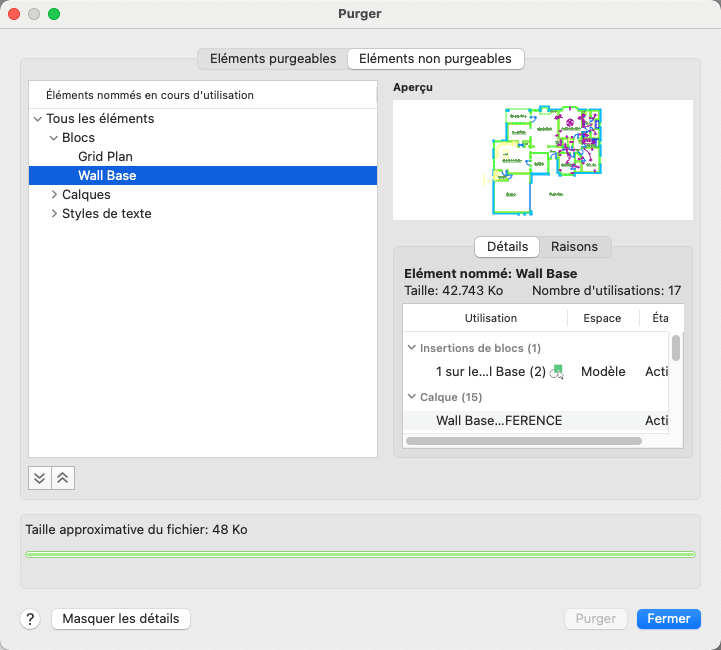 Prévisualisez les objets que vous ne pouvez pas purger et recherchez ces objets dans votre dessin.