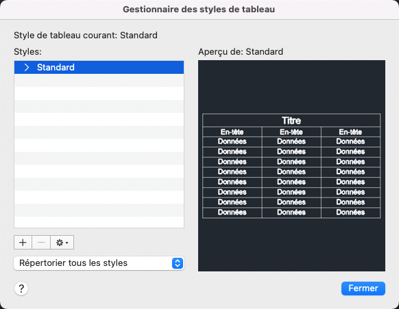 Les styles de tableau existants pour le dessin courant sont répertoriés dans la boîte de dialogue Gestionnaire des styles de tableau.