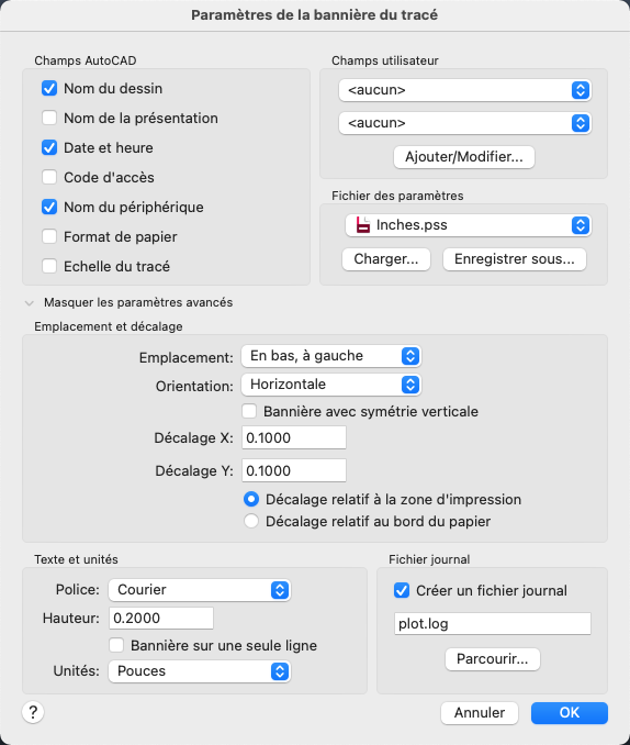 Ecrit les informations de bannière dans un fichier journal au lieu de les placer dans le tracé ou combine les deux opérations. Vous pouvez créer le fichier journal même si la bannière de tracé est désactivée.