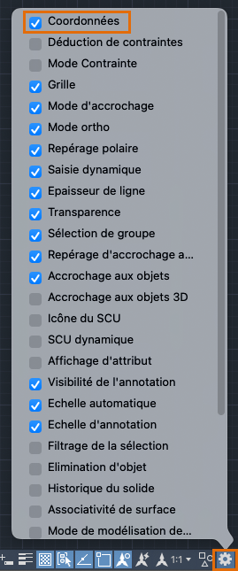 Pour modifier l'affichage des coordonnées dans la barre d'état