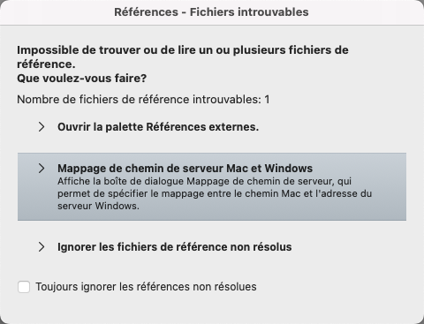 Lorsque les dessins principaux sont sur un ordinateur local et les références sur des serveurs, vous devez résoudre les références à l'aide de la boîte de dialogue Mappage de chemin de serveur.