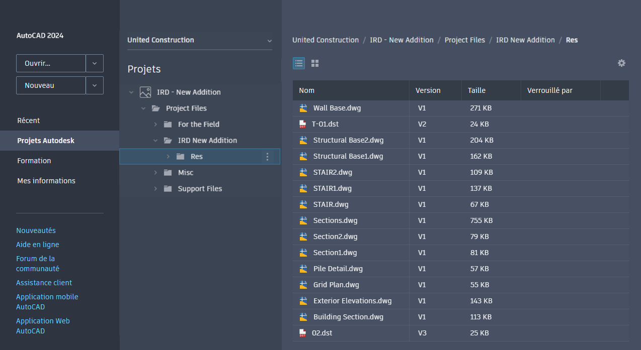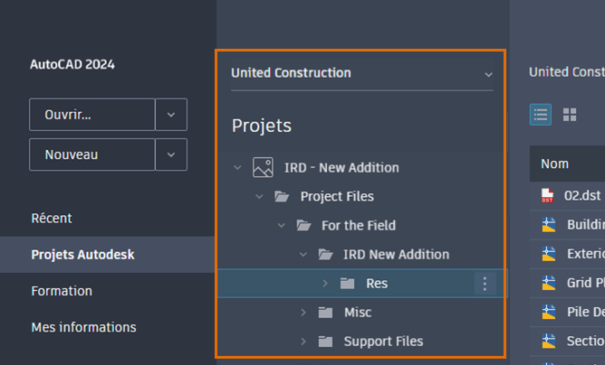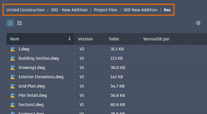 - Au-dessus de la liste des dessins du projet, des chemins de navigation s'affichent pour le chemin du projet courant.