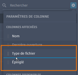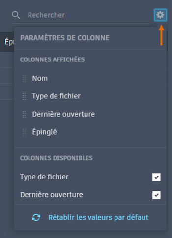 - Dans la vue sous forme de liste, vous pouvez personnaliser les en-têtes de colonne en cliquant sur Paramètres. Les colonnes Nom et Épinglé sont persistantes ;