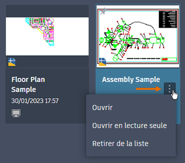 - L'icône du menu ouvert s'affiche lorsque vous placez le curseur sur une miniature de dessin. Cliquez pour afficher les options dans le menu.