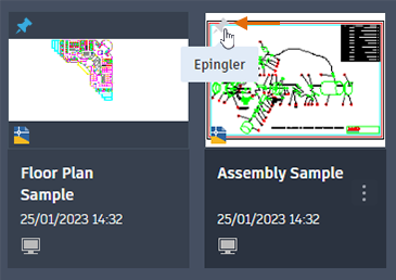 - L'icône de punaise s'affiche désormais dans le coin supérieur gauche lorsque vous placez le curseur sur la miniature d'un dessin.