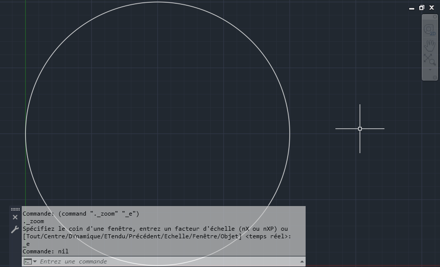 Un zoom est effectué sur l’étendue du cercle s’il s’agit du seul objet du dessin. Dans le cas contraire, un zoom est effectué sur l’étendue de tous les objets du dessin.