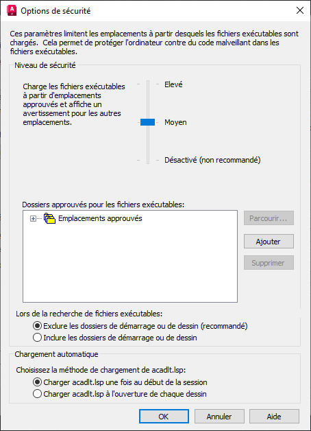 | SECURELOAD | Détermine si le chargement de fichiers exécutables est restreint aux seuls fichiers exécutables se trouvant dans des dossiers approuvés. | 1, peut être verrouillée par l’administrateur CAO | Registre |