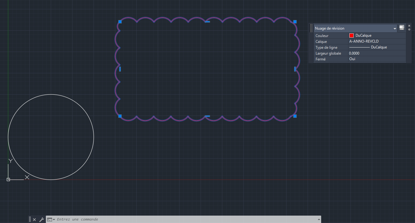 Notez que le nuage de révision est rouge et qu’il est placé sur le calque A-ANNO-REVCLD. Vous pouvez le voir dans la liste déroulante Calques du groupe de fonctions Calques du ruban ou dans les palettes Propriétés/Propriétés rapides.