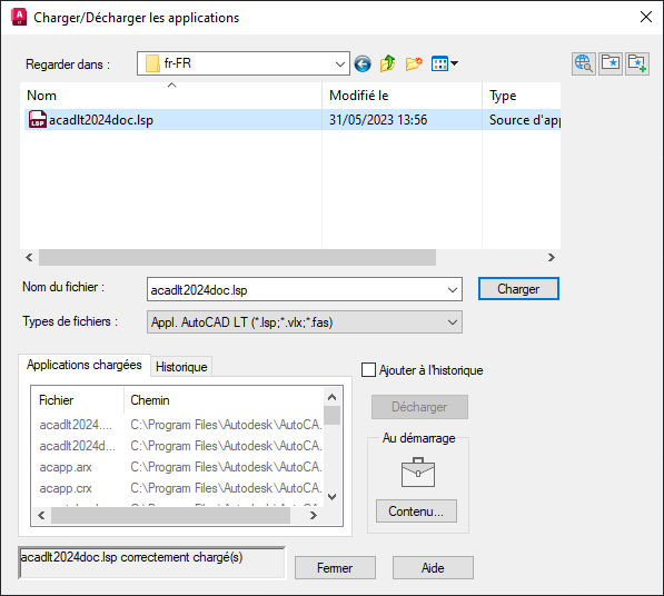 Dans la boîte de message, « acadlt2024doc.lsp correctement chargé(s) » s’affiche dans le coin inférieur gauche de la boîte de dialogue et dans la fenêtre de la ligne de commande.