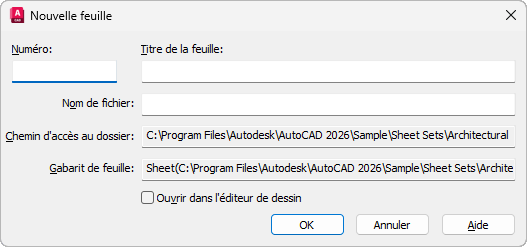 Indique le numéro de feuille. Il est recommandé de ne pas saisir le numéro de feuille lorsque vous créez une feuille pour la première fois. Par défaut, le nom du dessin et le nom de présentation de la nouvelle feuille seront formés du numéro de feuille et du titre de la feuille.