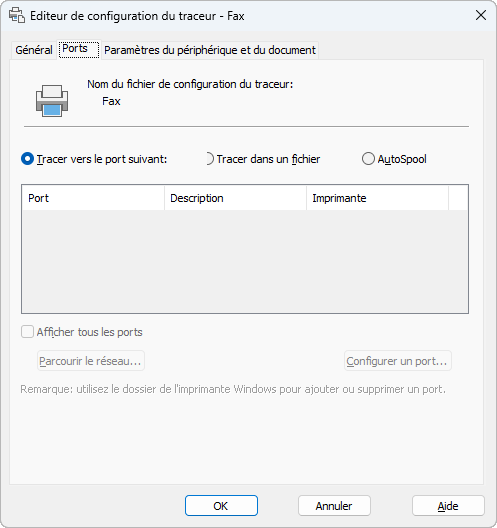 Cette zone affiche la liste et une description des ports locaux et réseau disponibles. Dans le cas des ports réseau, le nom de l'imprimante réseau est également fourni.