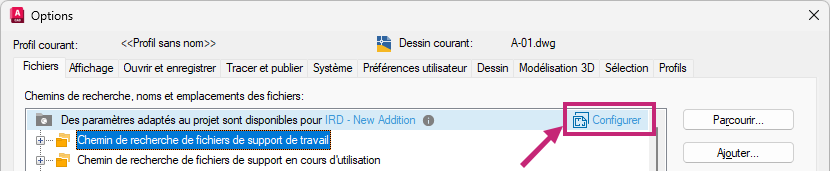 Remarque : Si vous ne voyez pas l’option Configurer, le projet a peut-être déjà été configuré. Vous pouvez vous en assurer selon que le texte suivant s’affiche : « Le dessin actif utilise des paramètres adaptés au projet ».