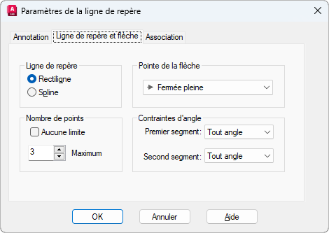 La boîte de dialogue Paramètres de la ligne de repère comporte les onglets suivants : Annotation, Ligne de repère et flèche, ainsi qu'Attachement.