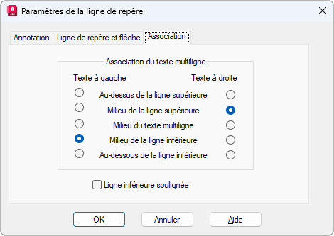 Définit l'emplacement d'attachement des lignes de repère et du texte multiligne d'annotation. Cet onglet est uniquement disponible si Textmult est sélectionné dans l'onglet Annotation.
