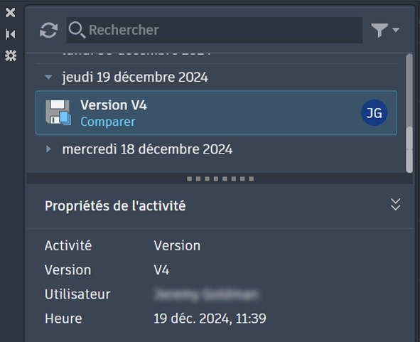 Remarque : Actuellement, AutoCAD LT affiche uniquement l’activité Version dans la palette Informations sur l’activité.