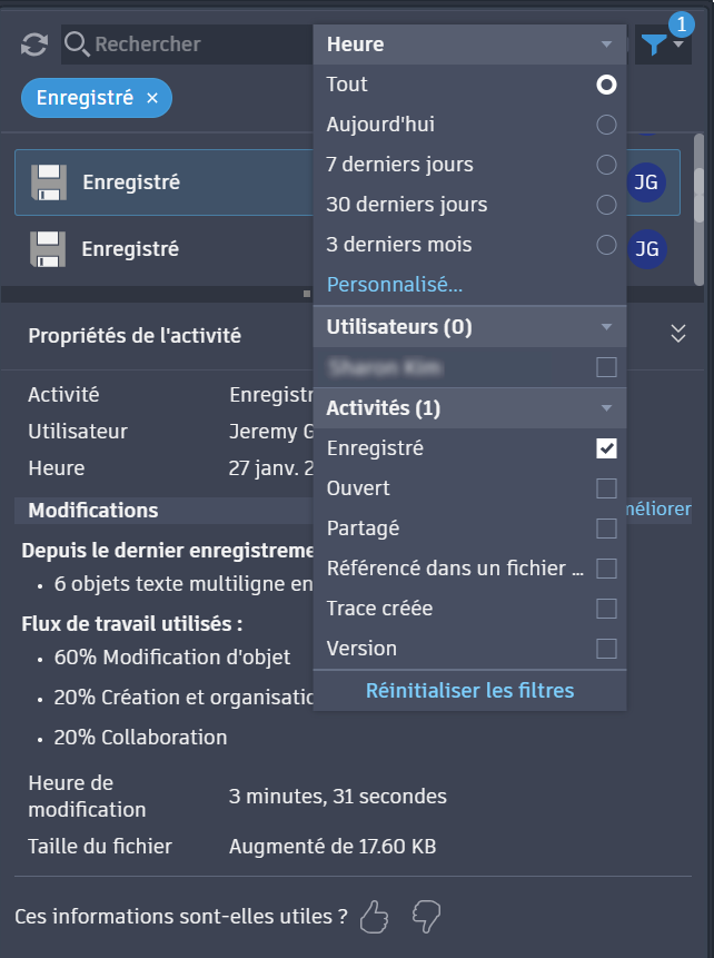 En sélectionnant Enregistré dans le filtre Activités, vous pouvez isoler l’activité Version. Pour filtrer davantage, utilisez les filtres Date et Utilisateurs.