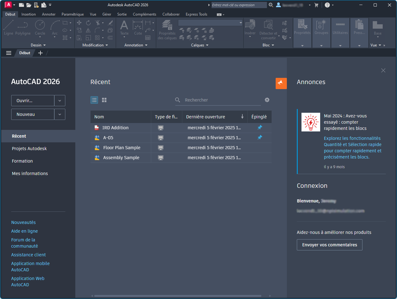 L'Accueil s'affiche par défaut au démarrage, fournissant un accès rapide à différents éléments, notamment aux fichiers gabarit de dessin, aux dessins et jeux de feuilles récemment ouverts, à des options en ligne et de formation ainsi qu'à des annonces.