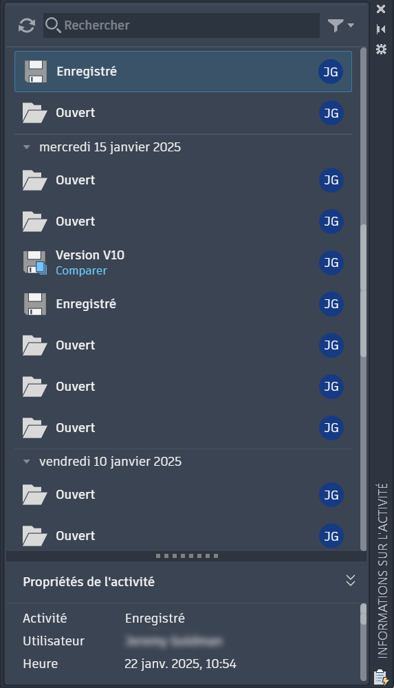 Utilisez Informations sur l’activité pour voir les contributions de vos collègues aux fichiers de dessin partagés, comparer les historiques des versions et collaborer sur d’autres produits AutoCAD.