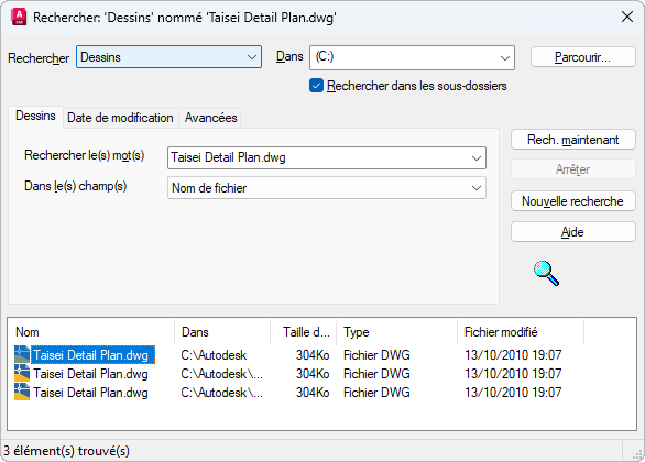 Indique le type de contenu à rechercher. Le type de contenu spécifié détermine les onglets affichés dans la boîte de dialogue Rechercher, ainsi que les champs de recherche proposés. Les onglets Date de modification et Avancées s'affichent uniquement si vous sélectionnez l'option Dessins dans la zone Rechercher.